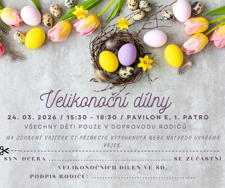 Vážení rodiče a milí děti, zveme Vás na Velikonoční dílny, které pro Vás připravily vychovatelky ŠD. Pokud si s námi chcete přiblížit kouzlo Velikonoc a vyrobit různé velikonoční dekorace, přijďte ve čtvrtek 10. 04. 2025 v době od 15:30 do 18:30 do pavilonu E, 1. patro. Zhotovení výrobku bude stát podle spotřebovaného materiálu. Všechny děti pouze v doprovodu rodičů.