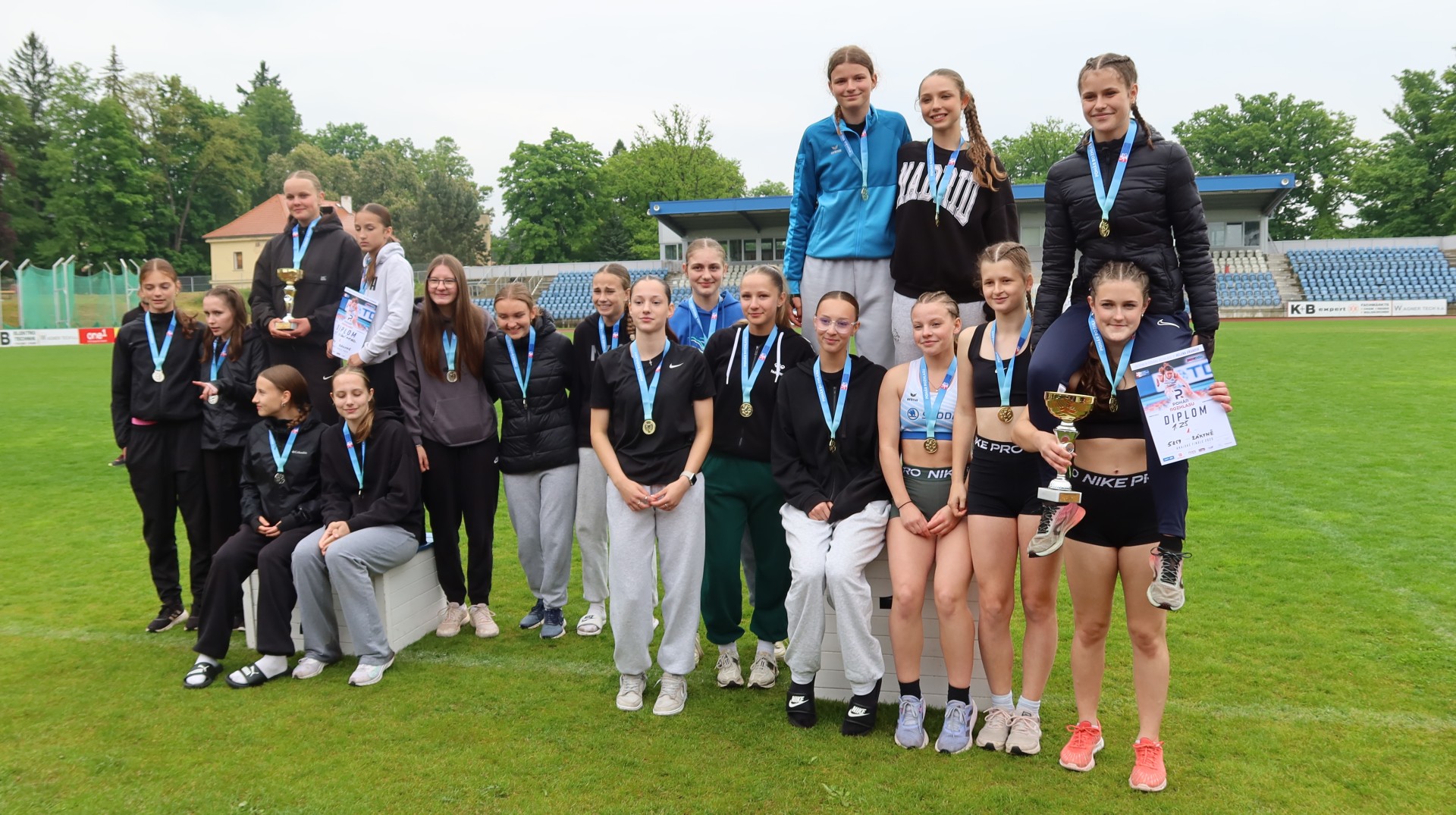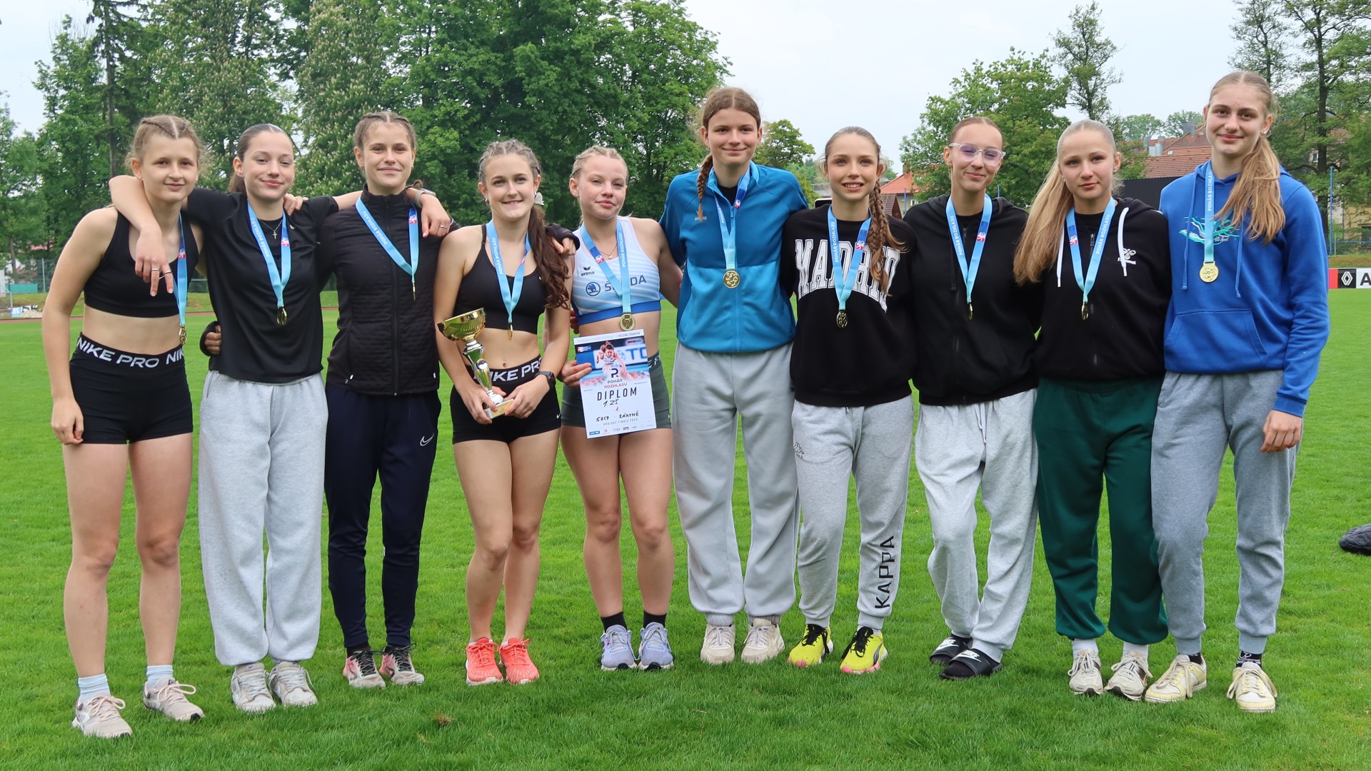 Ve čtvrtek 22. května 2025 se na stadiónu v Domažlicích konalo Krajské finále atletické soutěže Pohár rozhlasu. V mimořádně náročných podmínkách – za deště a chladného počasí – předvedly naše žákyně z 8. a 9. tříd neuvěřitelný výkon a dokázaly zvítězit nad všemi soupeřkami. Dívčí družstvo předčilo všechna očekávání a v silné konkurenci si zaslouženě vybojovalo 1. místo se ziskem 5 869 bodů.